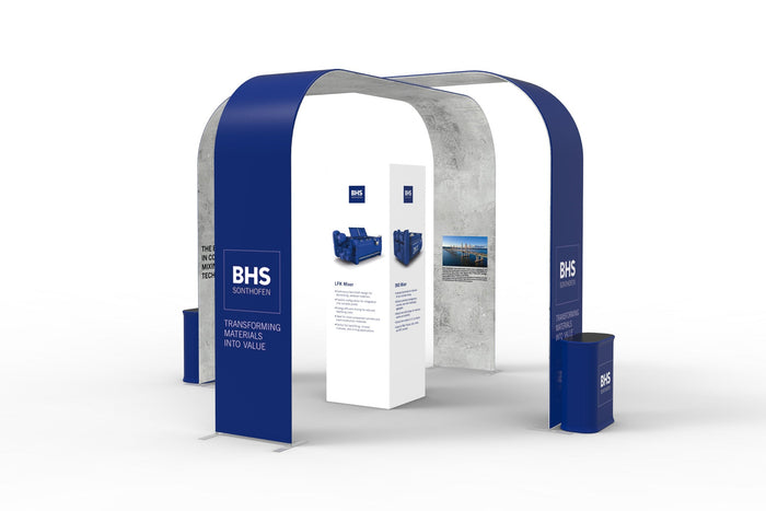 • The overhead arches are printed on both the inside and outside, so your design is visible from the aisle and from the center of your booth space.