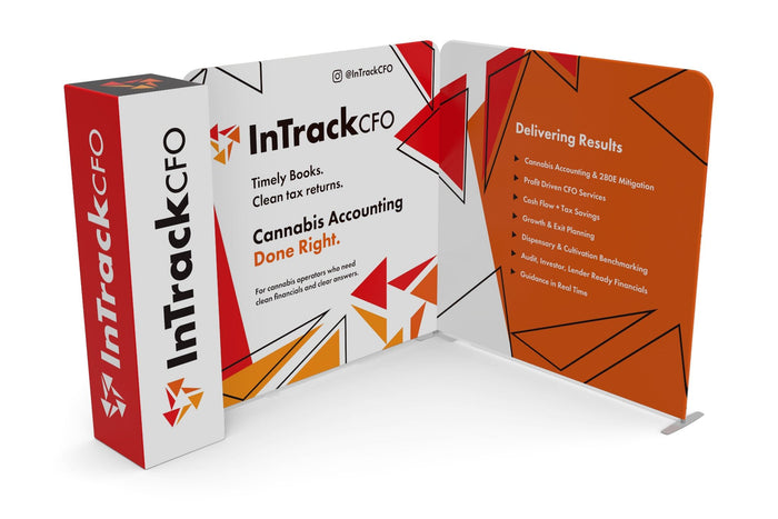 Pro Booth 2 is designed for a 8' max height 10x10 or 10x8 inline corner booth space. Allow 2 weeks for production (6 business days with Rush) followed by shipping.