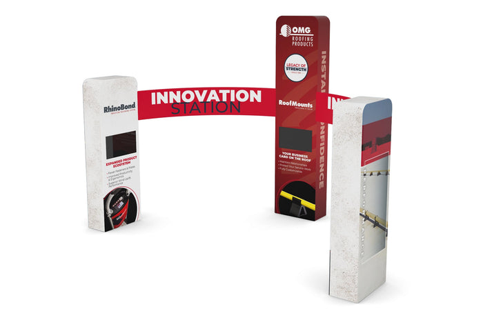 Pro Booth 16 is designed for a 20' W x 20' D island or peninsula booth space, total height of 14'. Allow 2 weeks for production (6 business days with Rush) followed by shipping.