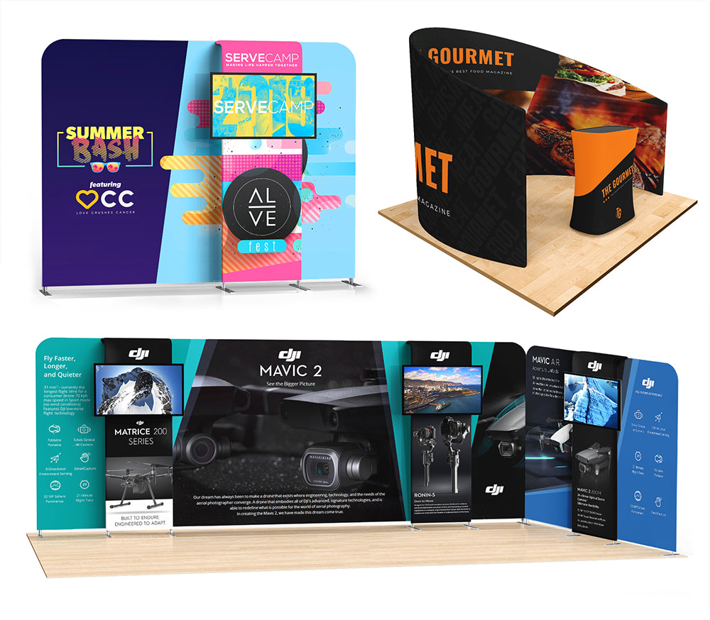 Create visually intriguing and engaging 3D spaces with Pro-Structures. Pro-Structures are go beyond flat walls and tables into semi-circular meeting areas and 3D arcs. Made from snap-together aluminum tubes and dye sublimated stretch fabric printed on all sides. Your graphic branding can be refreshed over time by replacing just the fabric print and re-using your hardware.